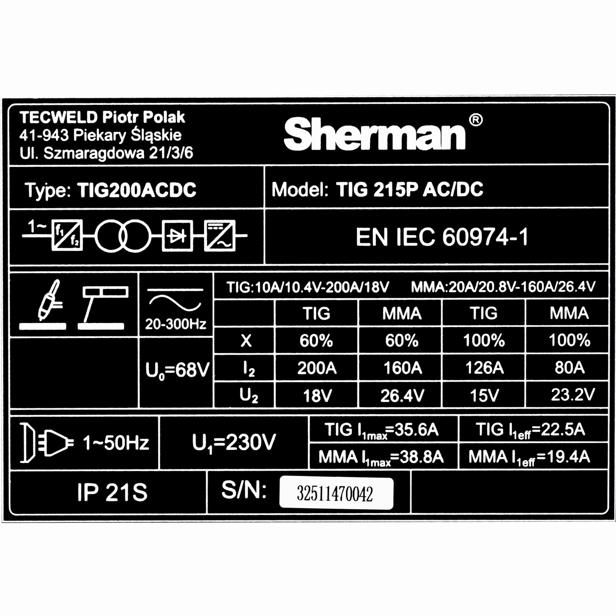Spawarka TIG AC/DC 215P Sherman 200A IGBT MMA | Puls, HF, 230V
