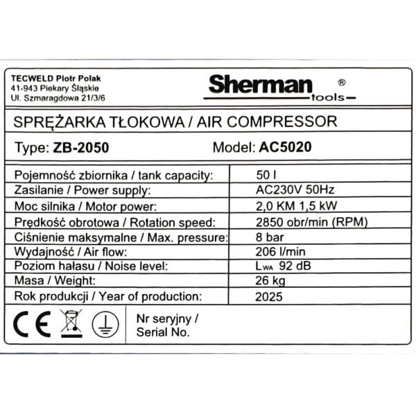 SPRĘŻARKA TŁOKOWA OLEJOWA SHERMAN 50L – WYDAJNOŚĆ I NIEZAWODNOŚĆ ⚙️